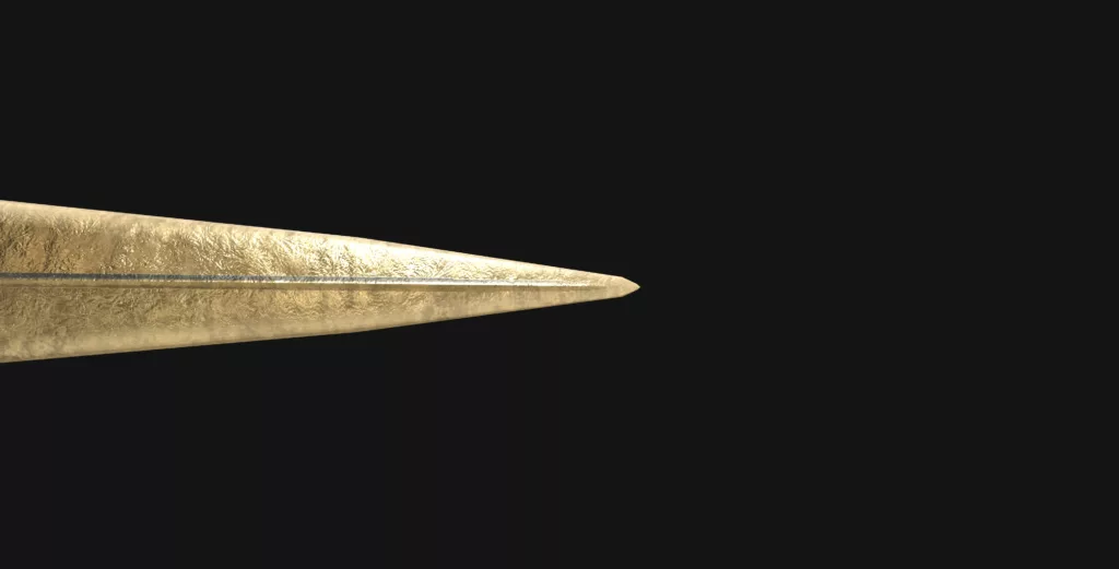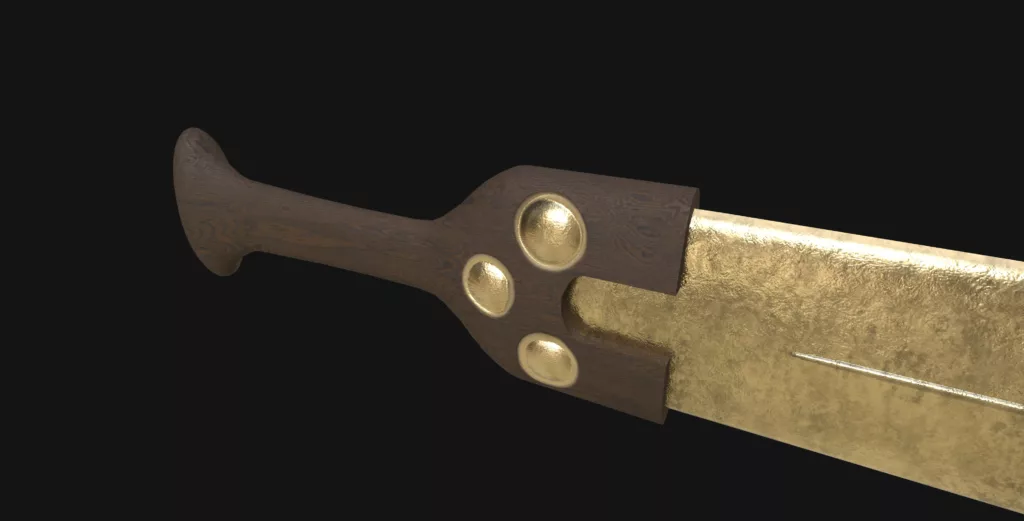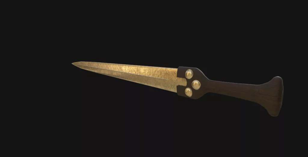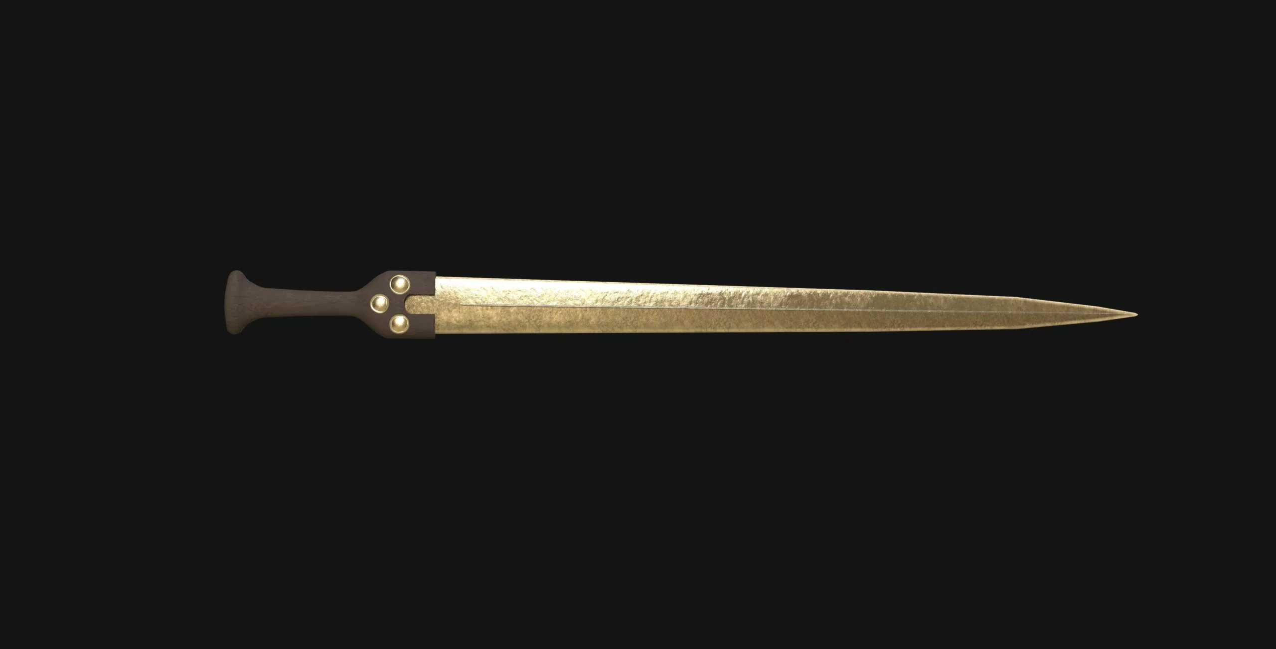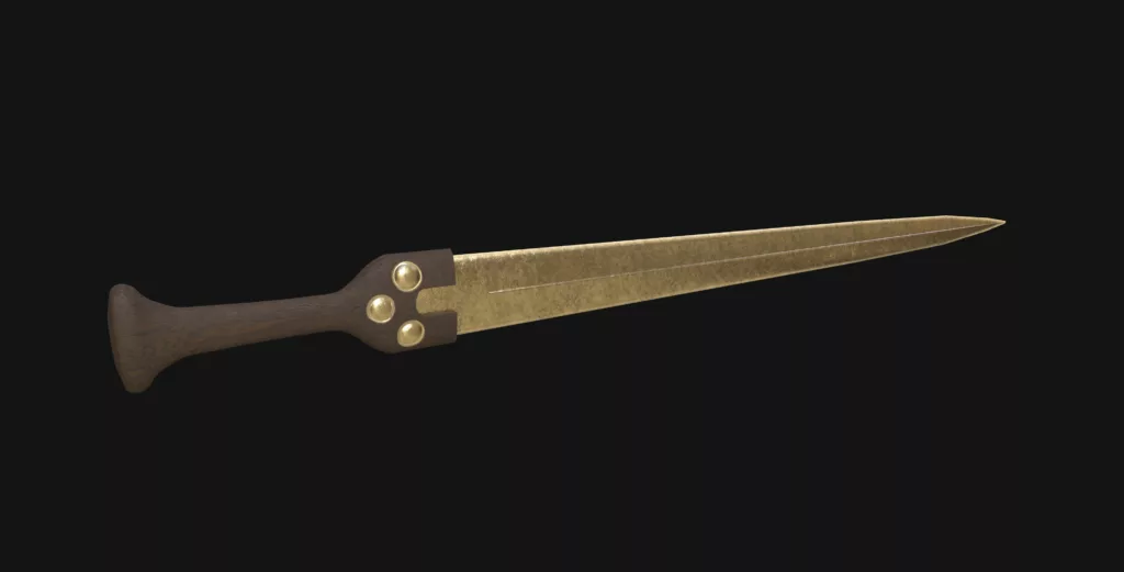 Model of an ancient bronze sword used around 16th century BC in Europe. Organic handle was mounted on broze blade with primitive glues and bronze pins. This type of sword was wielded by well trained warriors becouse it was used as pierce weapon. Slashing with this kind of blade was risky – it could be broken in the connection of blade and handle.